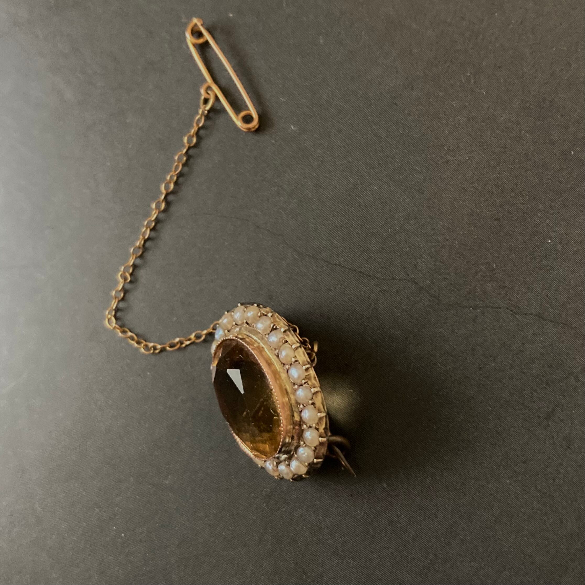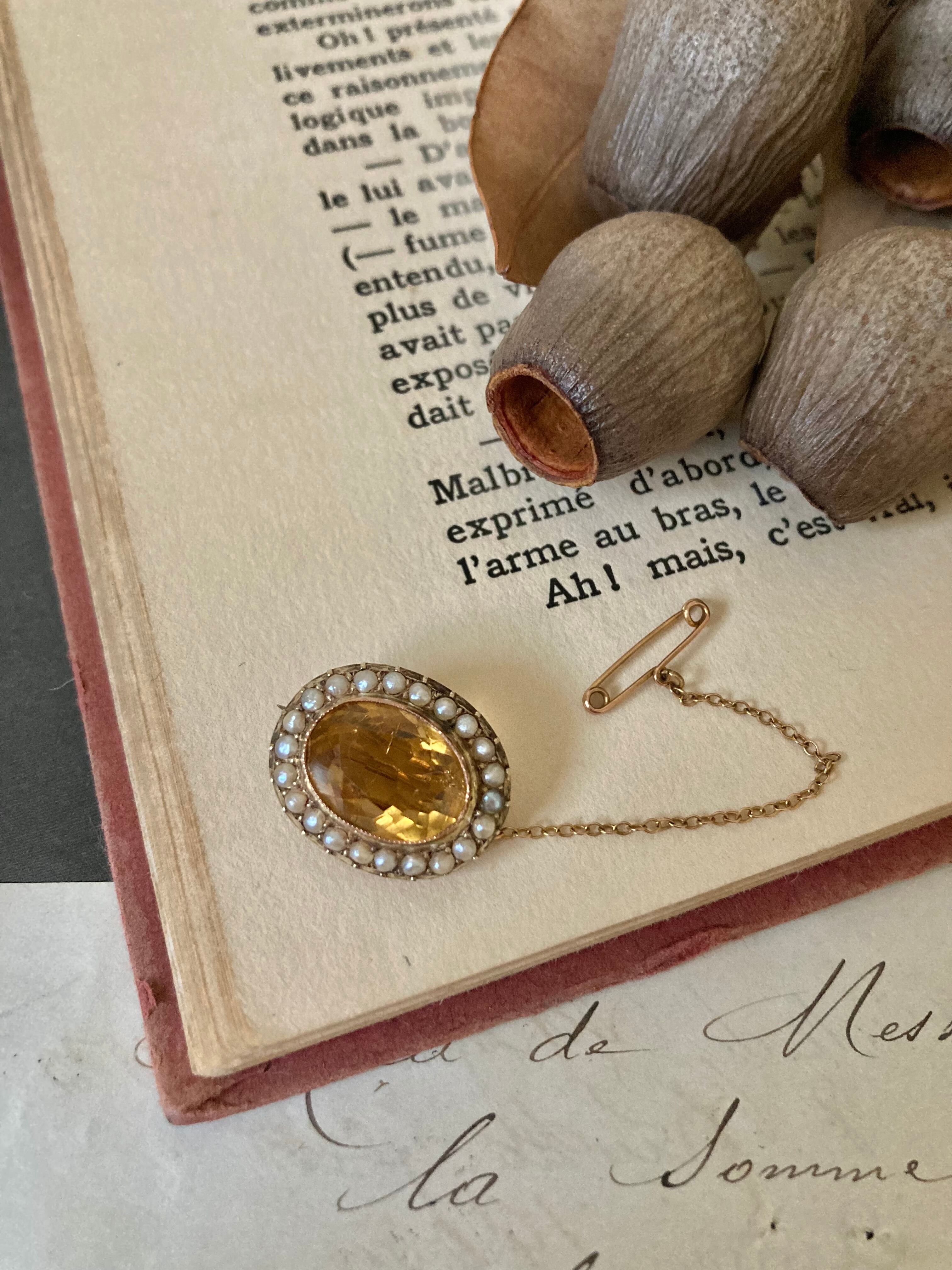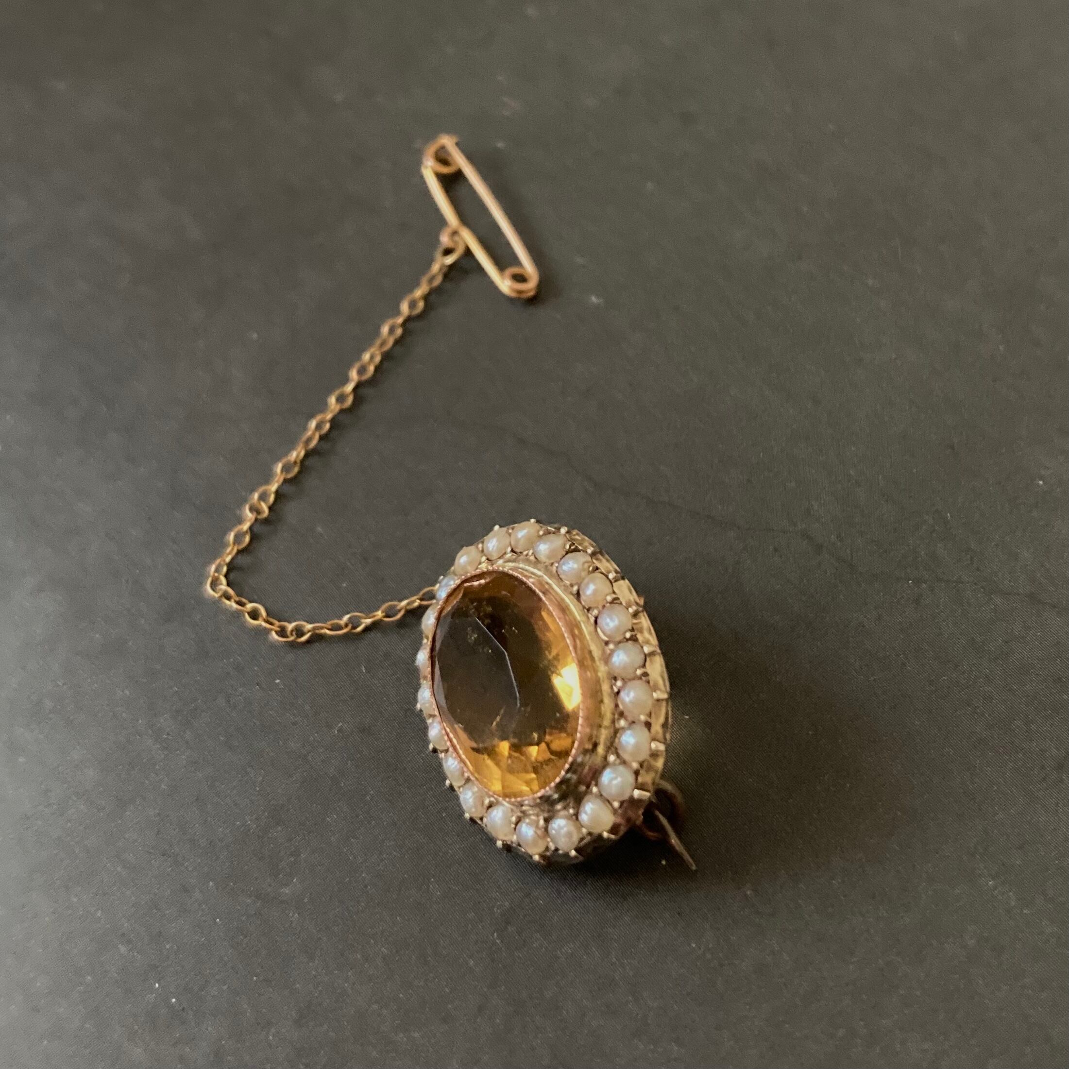 優しいオレンジとイエローの中間のお色が癒されるような天然クォーツに、シードパールが取り巻いた小ぶりのブローチです。