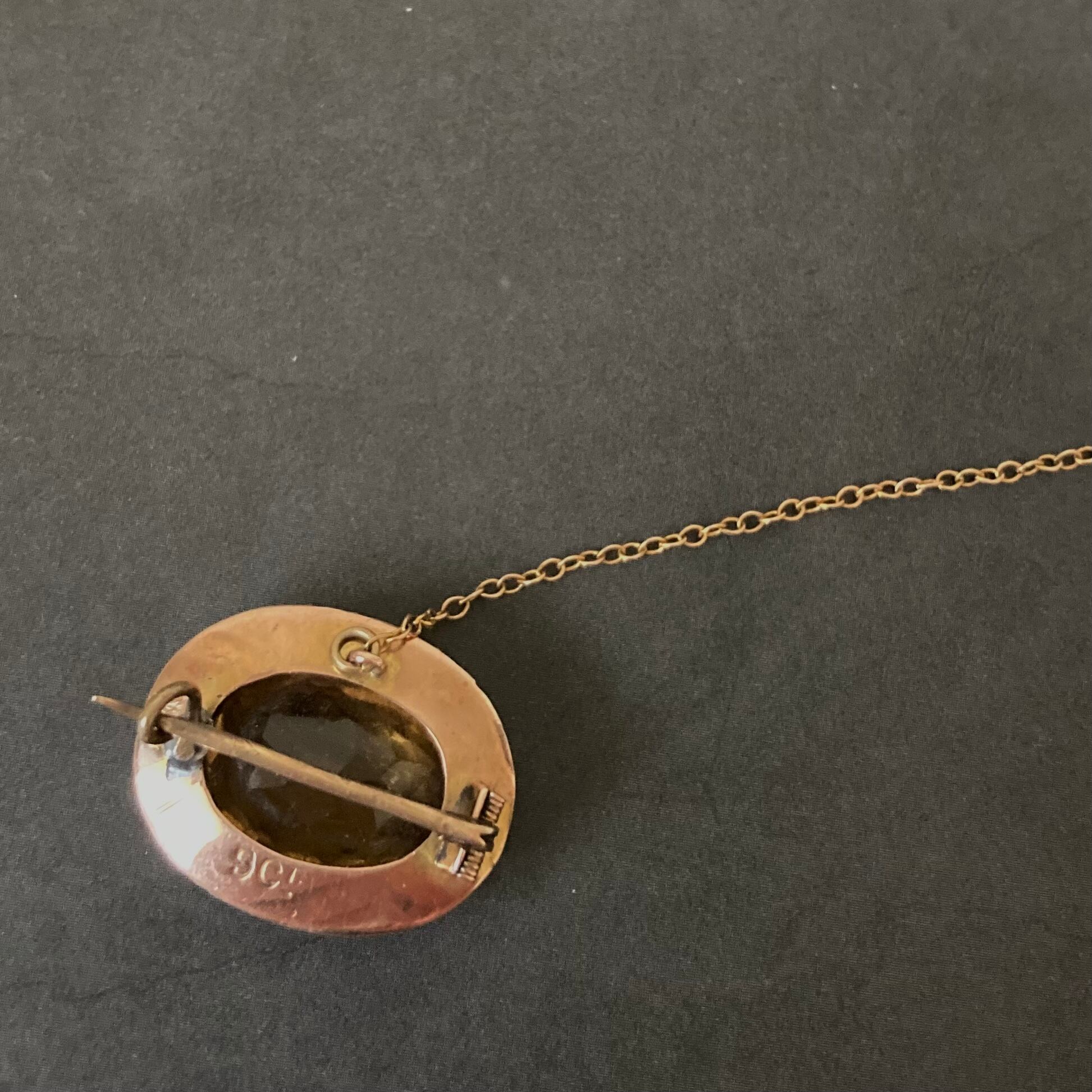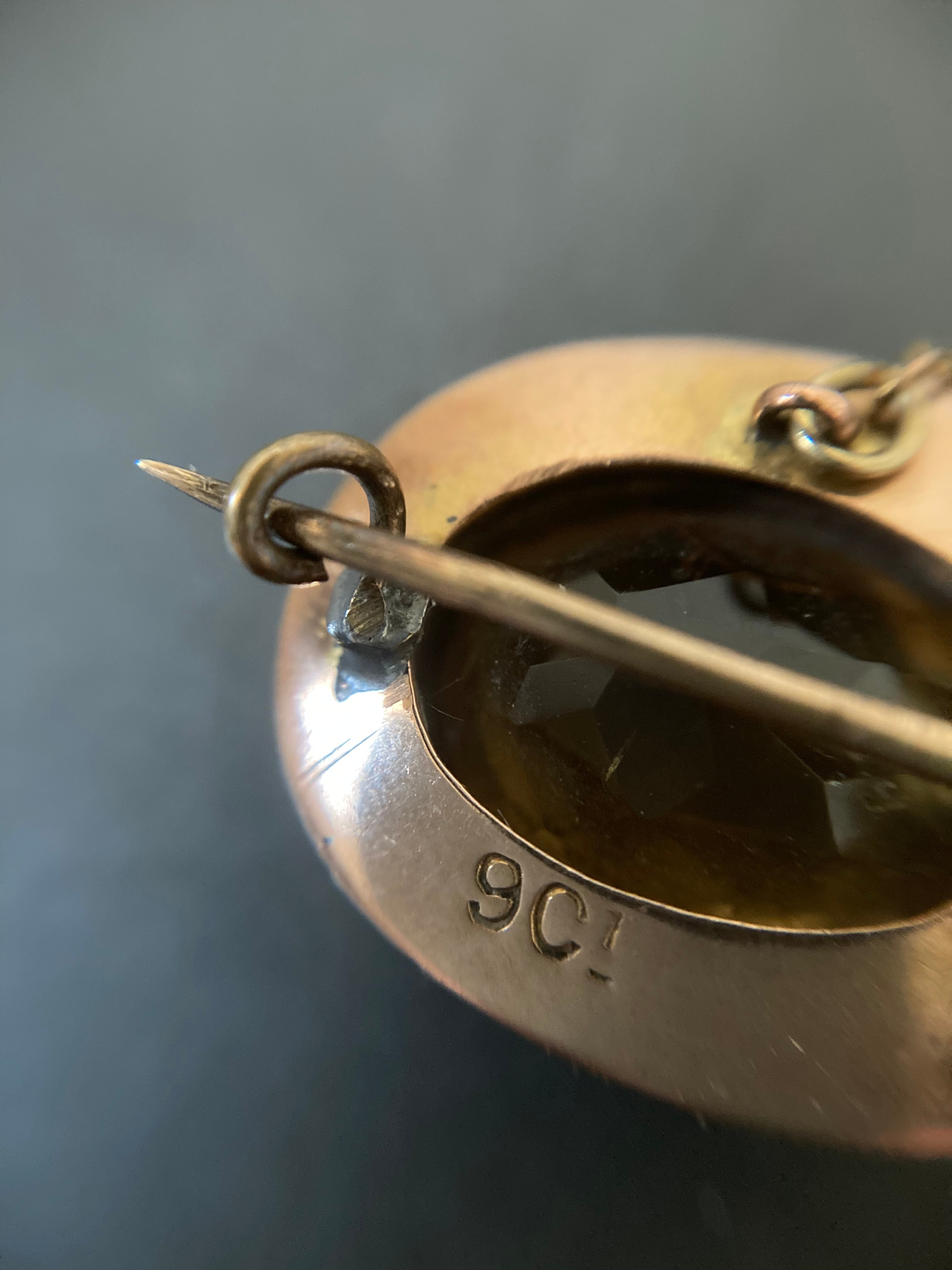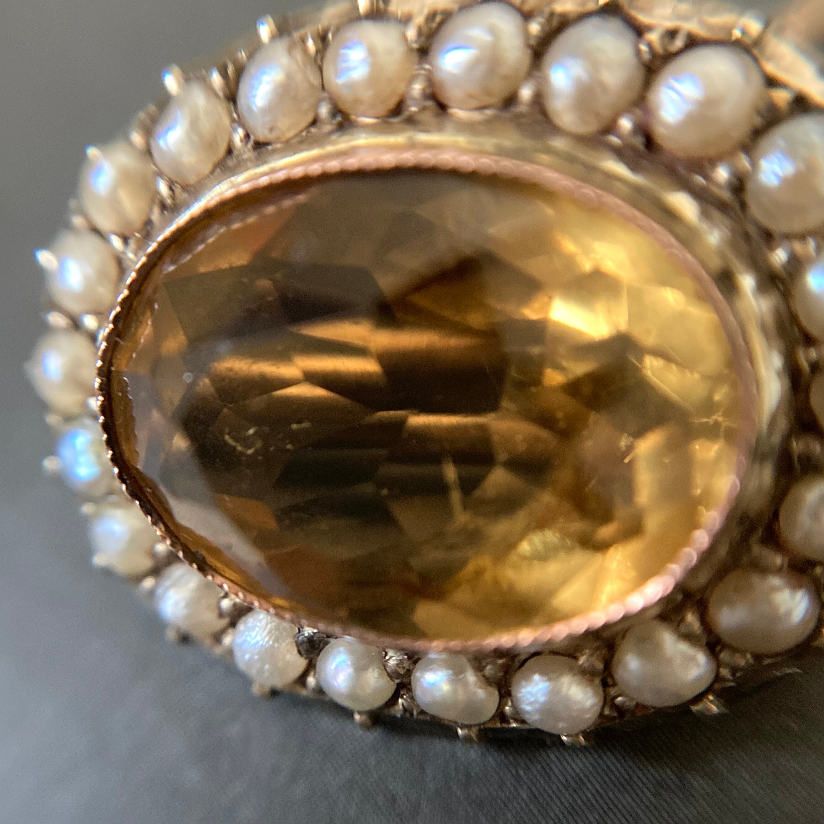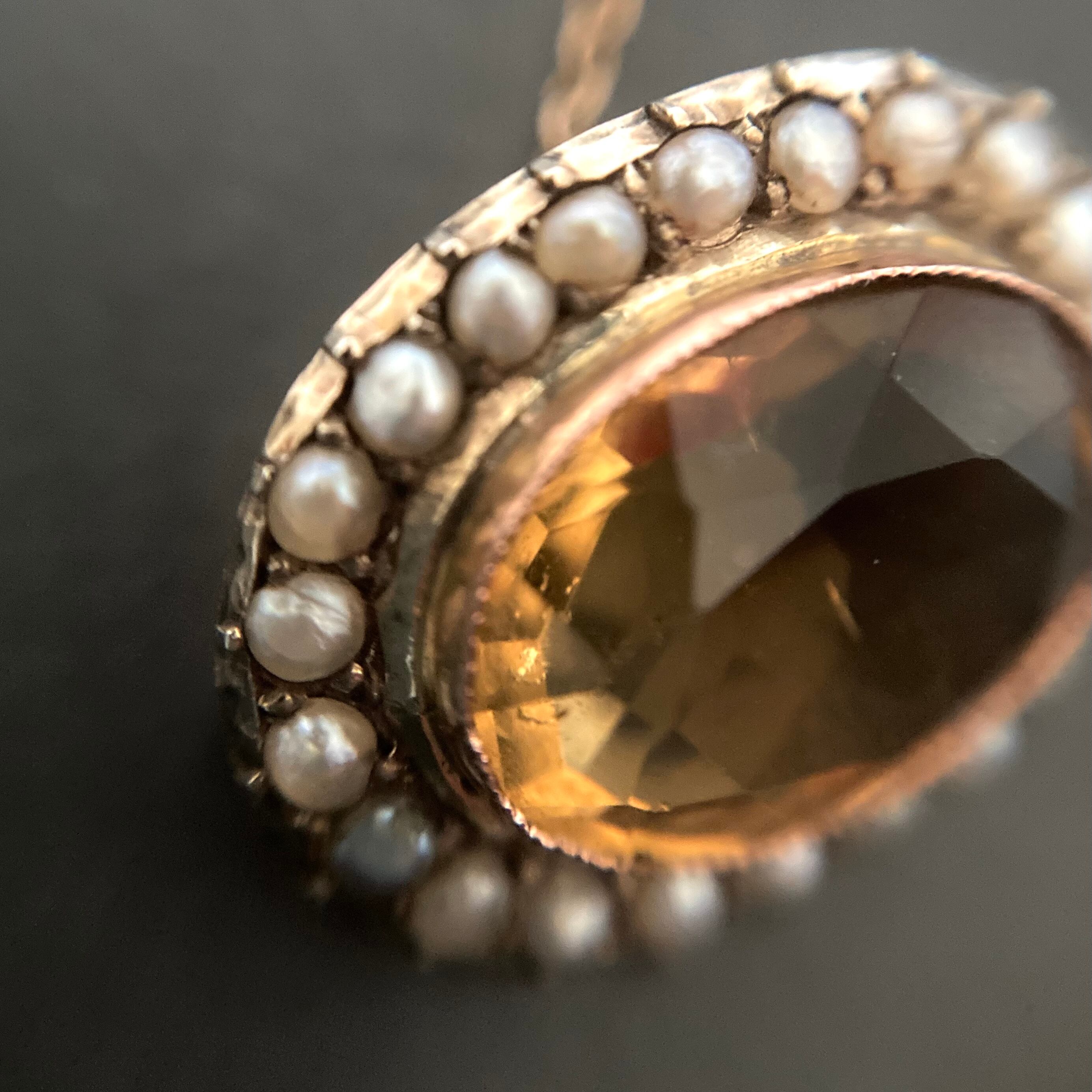 優しいオレンジとイエローの中間のお色が癒されるような天然クォーツに、シードパールが取り巻いた小ぶりのブローチです。